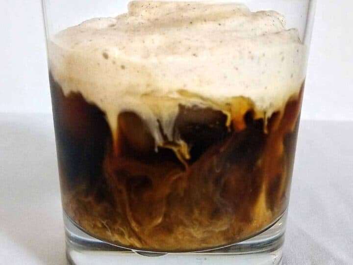 . Exchange out half of the milk with half half for extra creaminess. Pour the cold foam over the coffee. Strain the drink into a glass.